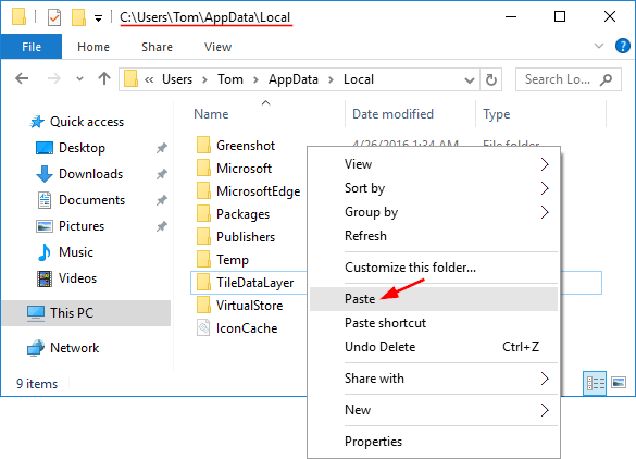 Note: You need to configure Windows 10 to show hidden files if you want to see the TileDataLayer folder.