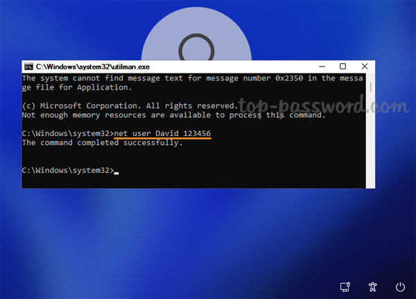 8. Close Command Prompt and you can then log in with your new password. To restore the original Utilman.exe, reboot with the installation media that you used earlier, and execute this command: