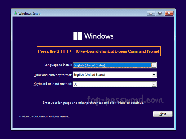 1. Boot your locked PC from Windows 11 installation media (CD or USB). When you get to the initial setup screen, press the SHIFT + F10 keyboard shortcut to open Command Prompt.