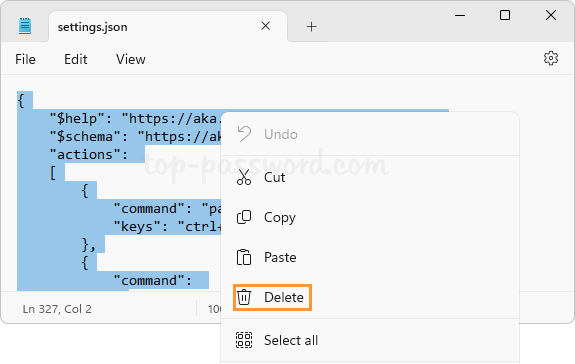 4. Select the Notepad app to open the JSON file. Next, press Ctrl + A to select all the content in the JSON file, right-click them and choose Delete.
