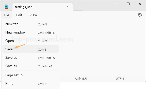 5. Click the File menu and choose Save. Close Notepad. Windows Terminal will immediately regenerate the JSON file with default settings.