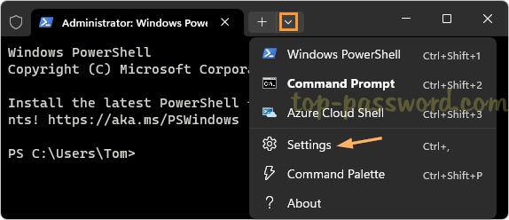 2. When the Windows Terminal opens up, click the down-arrow icon in the title bar and select Settings from the drop-down list.