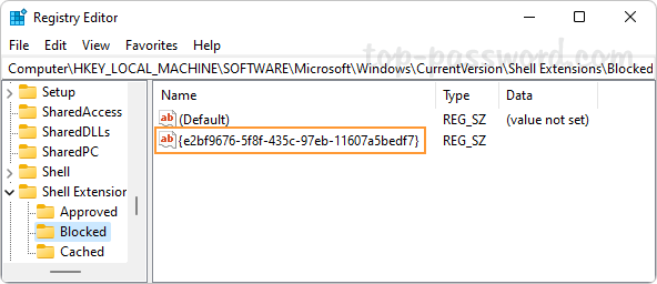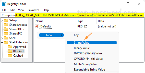 1. Open Registry Editor and navigate to the key: HKEY_LOCAL_MACHINE\SOFTWARE\Microsoft\Windows\CurrentVersion\Shell Extensions\Blocked. Right-click the blank area in the right pane and select New -> String Value.