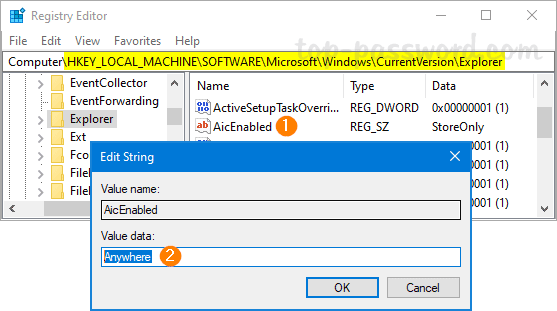 1. Open Registry Editor and navigate to: HKEY_LOCAL_MACHINE\SOFTWARE\Microsoft\Windows\CurrentVersion\Explorer. Look for a string named AicEnabled on the right pane, then double-click it and change its value from “StoreOnly” to “Anywhere”.
