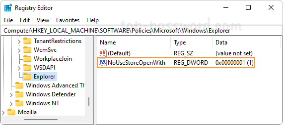 - Name this new DWORD “NoUseStoreOpenWith“, and change its value data to 1.