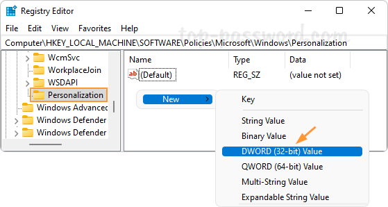 2. Name the new key Personalization and then select it. On the right side, right-click the blank area and choose New -> DWORD (32-bit) Value.
