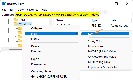 1. Open Registry Editor and use the left-hand side to navigate to: HKEY_LOCAL_MACHINE\SOFTWARE\Policies\Microsoft\Windows. Right-click the Windows key and select New -> Key.