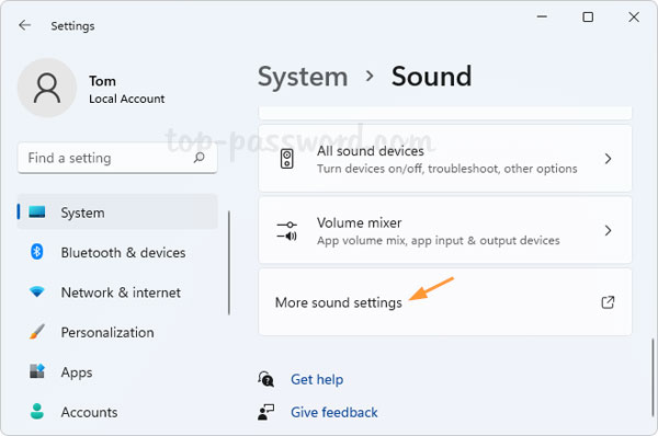 - The Settings app will launch and open to System -> Sound. In the right pane, scroll down to the bottom and click the “More sound settings” option.