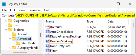1. Open Registry Editor and navigate to: HKEY_CURRENT_USER\Software\Microsoft\Windows\CurrentVersion\Explorer\Advanced. Look for the DWORD DisallowShaking in the right pane, and then double-click it to modify.