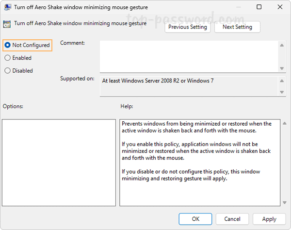 2. Set the “Turn off Aero Shake window minimizing mouse gesture” policy to Not Configured.