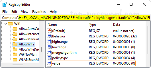 HKEY_LOCAL_MACHINE\SOFTWARE\Microsoft\PolicyManager\default\Wifi\AllowWiFi