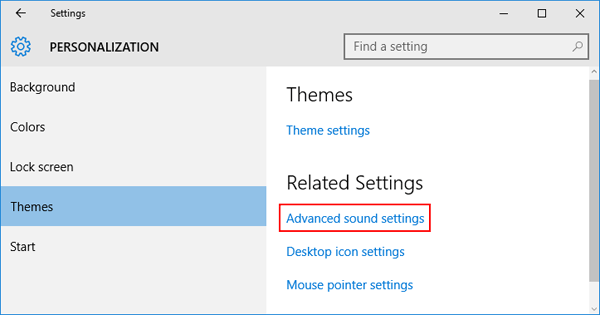 - When the Settings app loads up, click the Themes tab on the left, and then click the Advanced sound settings link on the right side.
