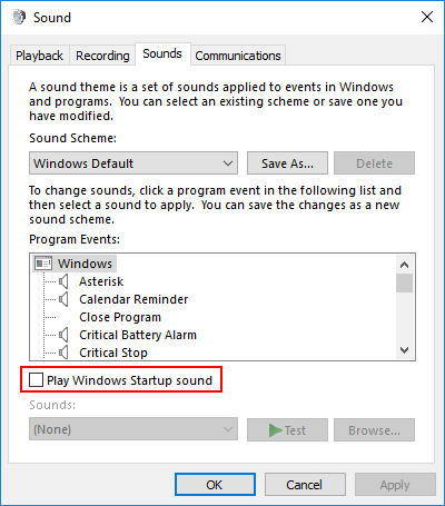 - From the Sounds Settings window, click the Sounds tab, uncheck “Play Window Startup sound” as shown in the screenshot below and click OK.