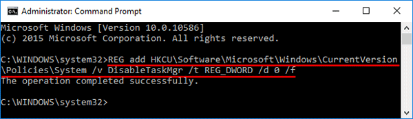 REG add HKCU\Software\Microsoft\Windows\CurrentVersion\Policies\System /v DisableTaskMgr /t REG_DWORD /d 0 /f