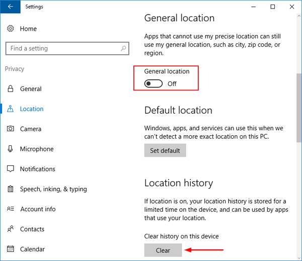 3. Select Location from the list on the left side. Scroll down to the Location history section, click the Clear button under Clear history on this device.