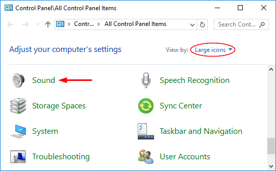 - Open the Control Panel in Large or Small icons view. Click the Sound option.