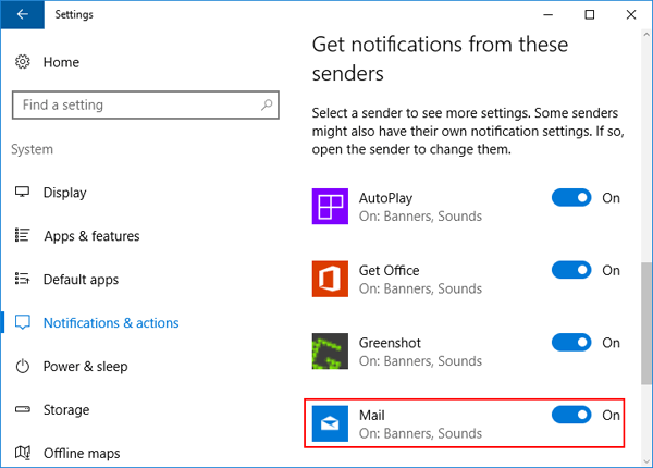 - On the left side of the window, click on Notifications & actions. Then, on the right side, scroll down to the “Get notifications from these senders” section, and click on the app that you want to block from playing notification sound.