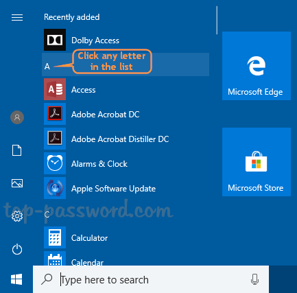 - Click the Start button to bring up the Start menu. You’ll see a long list of apps installed on your computer. Just click any letter (for example ‘A‘) to display the alphabet list.