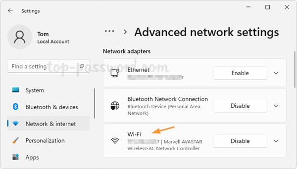 2. You’ll see a list of installed network adapters. Click on Wi-Fi or Ethernet to expand the settings, depending on your active internet connection.