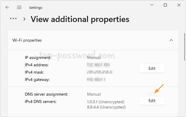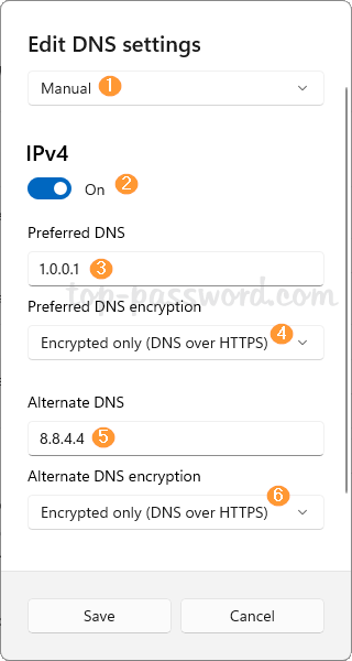 5. In the window that pops up, make sure the “Edit DNS settings” drop-down list is set to Manual. Turn on IPv4 and enter the primary and secondary DNS server addresses which support DoH. Select the “Encrypted only (DNS over HTTPS)” option for both DNS servers.