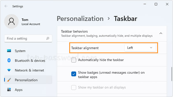 3. Click the Taskbar alignment drop-down box, and change it from Center to Left.