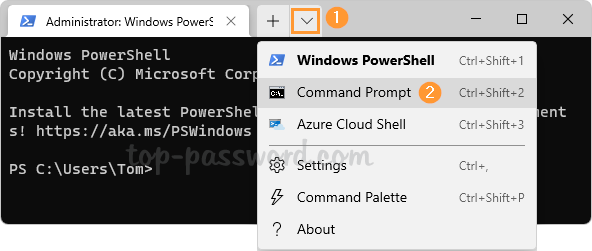 1. To get started, open Windows Terminal as admin. If Windows Terminal opens PowerShell by default, click the down-arrow button located in the title bar and select “Command Prompt“.