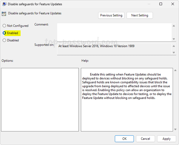 Computer Configuration -> Administrative Templates -> Windows Components -> Windows Update -> Manage updates offered from Windows Updates, then double-click the “Disable safeguards for Feature Updates” policy in the right pane.