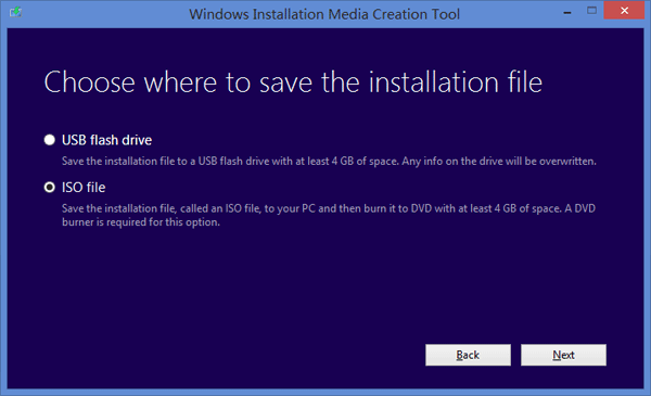 4. After clicking the Next button, you’ll be presented with two options to save the installation file: create a Windows 8.1 installation USB drive or save the setup ISO image for later user. If you don’t have a USB drive at hand, you should select the 2nd option to save the installation ISO image on your PC which can then be burned to a DVD.