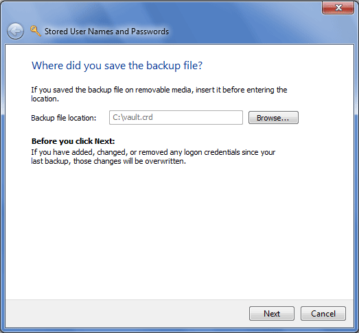 - Click on the Restore vault link in the Credential Manager. This will bring up the Stored User Names and Passwords wizard.