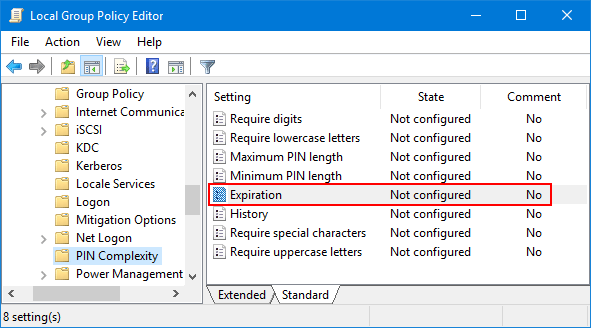 Computer Configuration\Administrative Templates\System\PIN ComplexityNext, double-click the Expiration policy in the right pane.