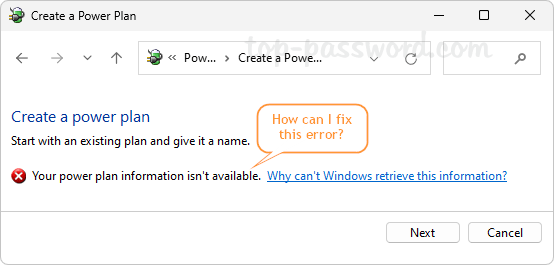When you try to edit or create a power plan from the Control Panel, you may receive the error message “Your power plan information isn’t available. Why can’t Windows retrieve this information?