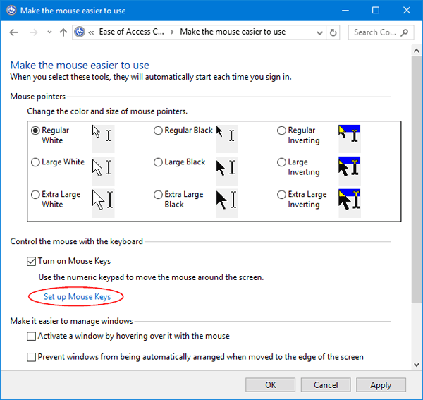 • By default, Mouse Keys will work only when NUM LOCK is On. You can change this to Off if you like.