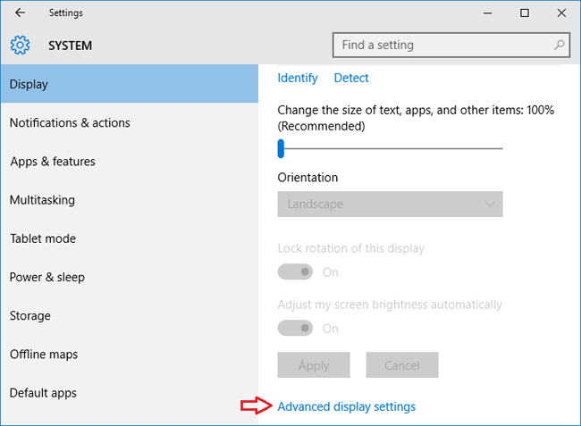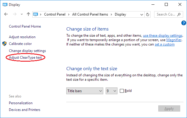 - On the right pane of the Display window click on Adjust ClearType Text link.