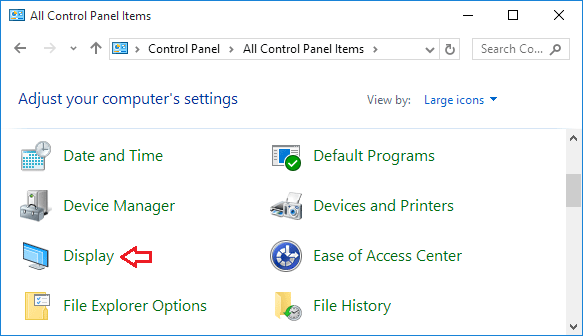 - When you see the Control Panel, set the View by option to Large icons. Click on Display.