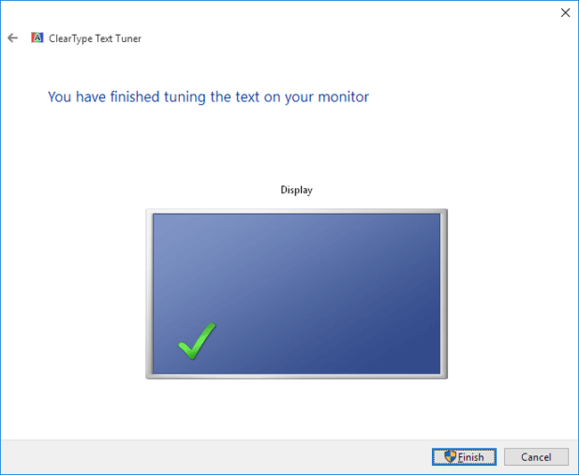 - On the appearance of last window click Finish after completing the tuning of the text for your monitor.