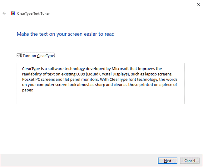 - A ClearType Text Tuner window will appear on your screen. Check or uncheck the checkbox Turn on ClearType and click Next button to begin tuning the text on your monitor.