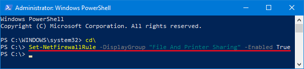 Open Windows PowerShell as administrator. Copy and paste the command below to enable file and printer sharing for all network profiles:
