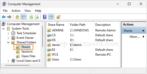 4. You’ll see all network shares in the right pane, including the hidden administrative shares for each drive on your system ( C$ for the C drive). Additionally, you can click the “Open Files” (or “Session“) node from left navigation pane to see who is accessing which shared folders on your computer.