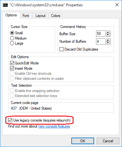 Go to the Options tab and you can see a new option called “Use legacy console (requires relaunch)“. In Windows 10, the new console is enabled by default so you should see the “Use legacy console” option is unchecked.