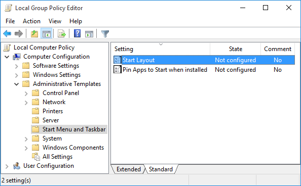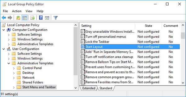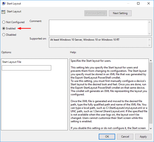 On the right-side of Local Group Policy Editor, double-click the entry labelled Start Layout to open its properties, select Enabled, and then click Apply.
