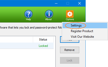- Open up the Lock My Folders application installed on your new computer. Click on the Options button at the top-right corner and then select Settings.