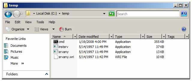 Copy Srvany.exe and Instsrv.exe to a temporary folder, for example C:\temp. Copy cmd.exe to this folder too (cmd.exe is the command prompt, usually located at %WINDIR%\System32).