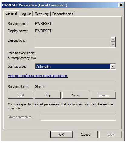 - Double click the file C:\temp\cmd.exe to open a command prompt, then type: instsrv PWRESET "C:\temp\srvany.exe".