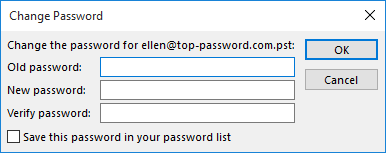 Type your current pst password (or leave it blank if you your pst file is not password protected), then type a new password and confirm it. Uncheck the option "Save this password in your password list" if this is a shared computer. Click OK.