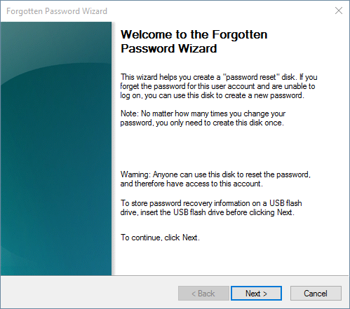 - When the Forgotten Password Wizard appears, insert your USB thumb drive and then click Next.