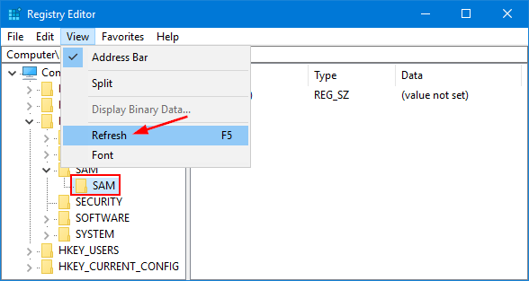 Now, back to the Registry Editor window. Select the SAM key in the left pane and press F5 to refresh registry.