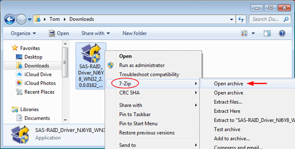 After installing 7-Zip, right-click on your downloaded driver package, and then select "7-Zip" -> "Open archive" from the context menu.