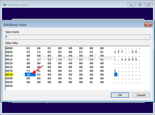 The "Edit Binary Value" window will open with hex values. Change the binary value shown at offset 0038 from 11 to 10.