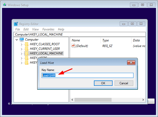 When the Load Hive dialog appears, give the hive you're loading a unique name (such as "Load-SAM"), and then click OK.